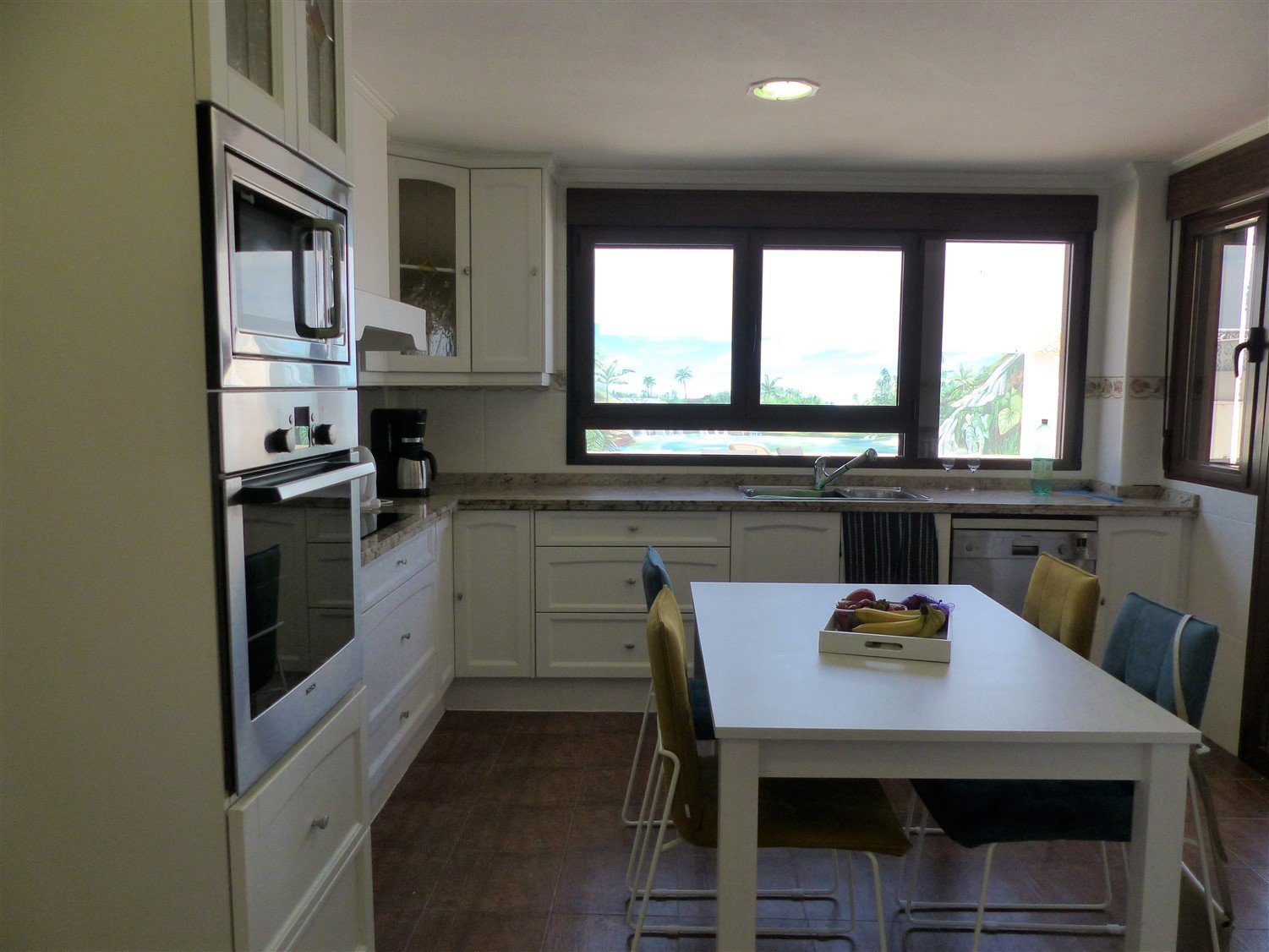 Via het zonnige terras bij de voordeur komt u in de gang die toegang geeft tot de gezellige woon-/eetkamer met zeer comfortabele, moderne meubels en aparte airco. De ruime keuken is o.a. voorzien van grote Amerikaanse koelkast, vaatwasser, magnetron en keramische kookplaat. Kortom voorzien van alle luxe, die men zich op een vakantie wensen kan. De oppervlakte van deze ruimtes is ruim 70m2.